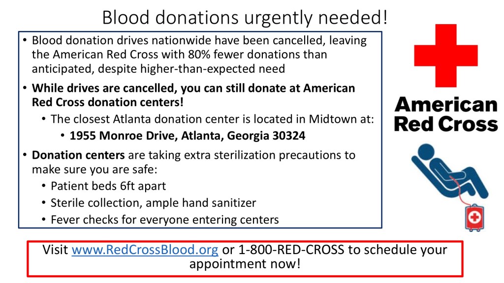 Though Governor Kemp issued a statewide shelter-in-place order, blood donation operations (including donors and volunteers) are currently considered essential activities. In order to ensure no issues with allowance to travel to these opportunities, please carry your Emory ID with you at all times during transit. Anyone with any questions pertaining to our allowance to transit to these events should contact Angela Adams, angela.adams@emory.edu, from the Office of Critical Event Preparedness and Response.
