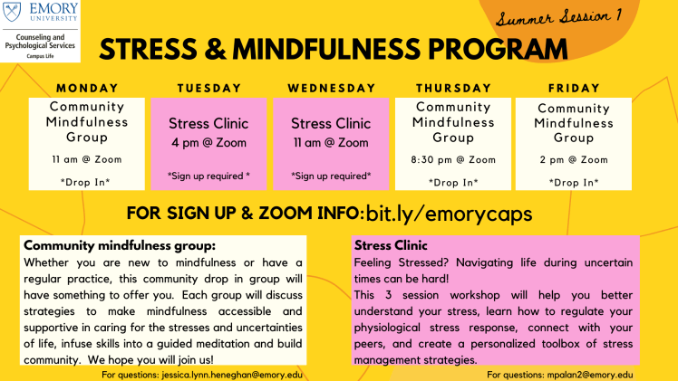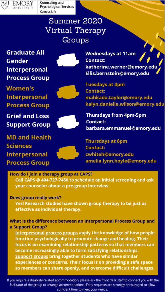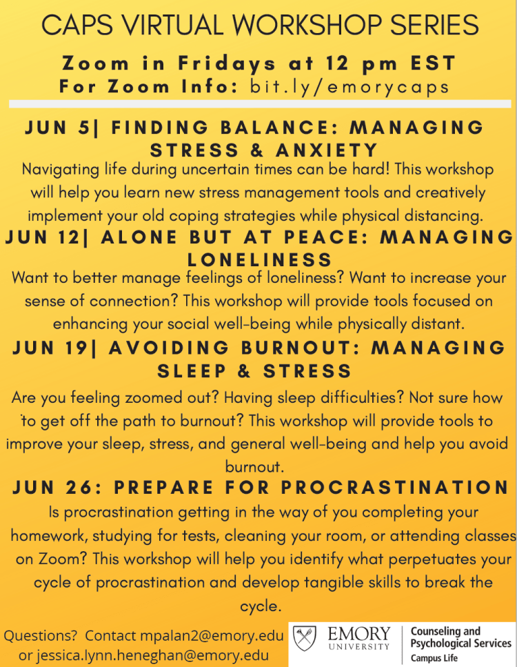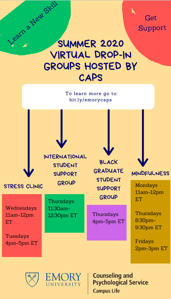 | Mental Health Counseling: Students can call CAPS 404-727-7450 to speak with a counselor via zoom | Monday-Friday, 8:30AM-5:00PM |